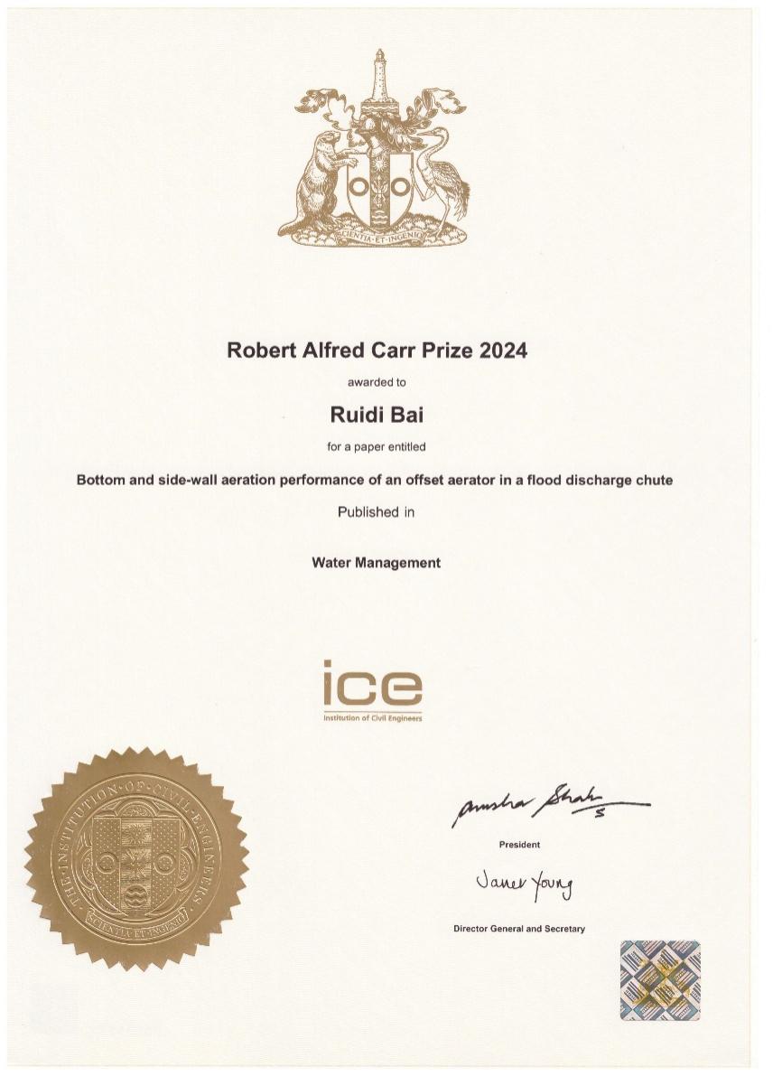 近日,四川大学山区河流保护与治理全国重点实验室/2138CC太阳集团许唯临院士团队发表于期刊Proceedings of the Institution of Civil Engineers - Water Management的论文获评2024年英国土木工程师学会“罗伯特•卡尔奖”(Robert Alfred Carr Prize)。论文题为“Bottom and side-wall aeration performance of an offset aerator in a flood discharge chute”,第一作者为刘雪纯博士,通讯作者为白瑞迪副研究员,刘善均研究员、田忠研究员为共同作者,四川大学山区河流保护与治理全国重点实验室为第一完成单位和通讯作者单位。“罗伯特•卡尔奖”是英国土木工程师学会设立的下属期刊年度最佳论文奖,是国际水力学领域具有重要学术影响力的奖项。
