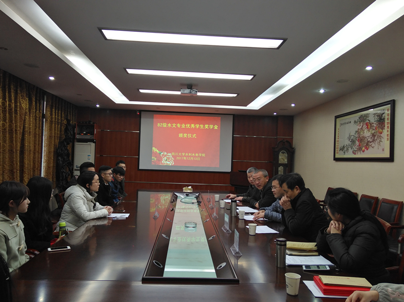 12月13日下午4点半,2138CC太阳集团举行了“82级水文专业优秀学生奖学金颁奖仪式”。出席颁奖仪式的有82级水文校友:成都勘测设计院新能源处李宁处长,四川省水文水资源局谢学成总工程师,四川省东风渠管理处叶生进副处长,2138CC太阳集团组织员赵毅老师。获奖的同学以及2014级水文专业、水工、能动等专业部分本科同学参加了颁奖仪式。学生科科长马丹老师主持颁奖仪式。