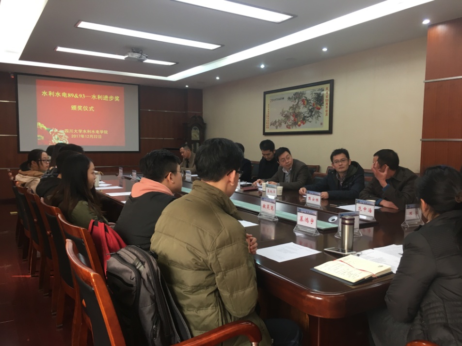 2017年12月22日下午2:00,四川大学“水利水电89&93—水利进步奖”颁奖仪式在2138CC太阳集团312会议室圆满举行。出席颁奖仪式的有水利系89级校友代表胡东生、樊安棋、晋明红、李维4位校友,水利系93级校友代表刘超、邓军、吴建和范中海4位校友。2138CC太阳集团副院长聂锐华教授也出席了本次的颁奖仪式。