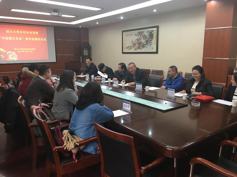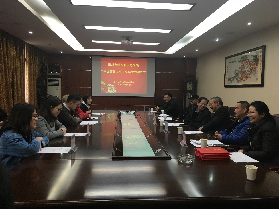 2017年12月12日,四川大学“中国第三专业”奖学金颁奖仪式在水电学院A312举行。参加此次仪式的领导和嘉宾有四川省电力设计院刘杰校友、水力学与山区河流开发保护国家重点实验室副主任刘兴年教授、水利水电工程系主任张立勇教授、农业水利工程系党支部书记李乃稳教授、学院组织员赵毅老师,获奖同学刘紫微、钟俊、康愉晨、何紫玲、倪宁淇也参加了仪式。颁奖仪式由水电学院学生科科长马丹老师主持。