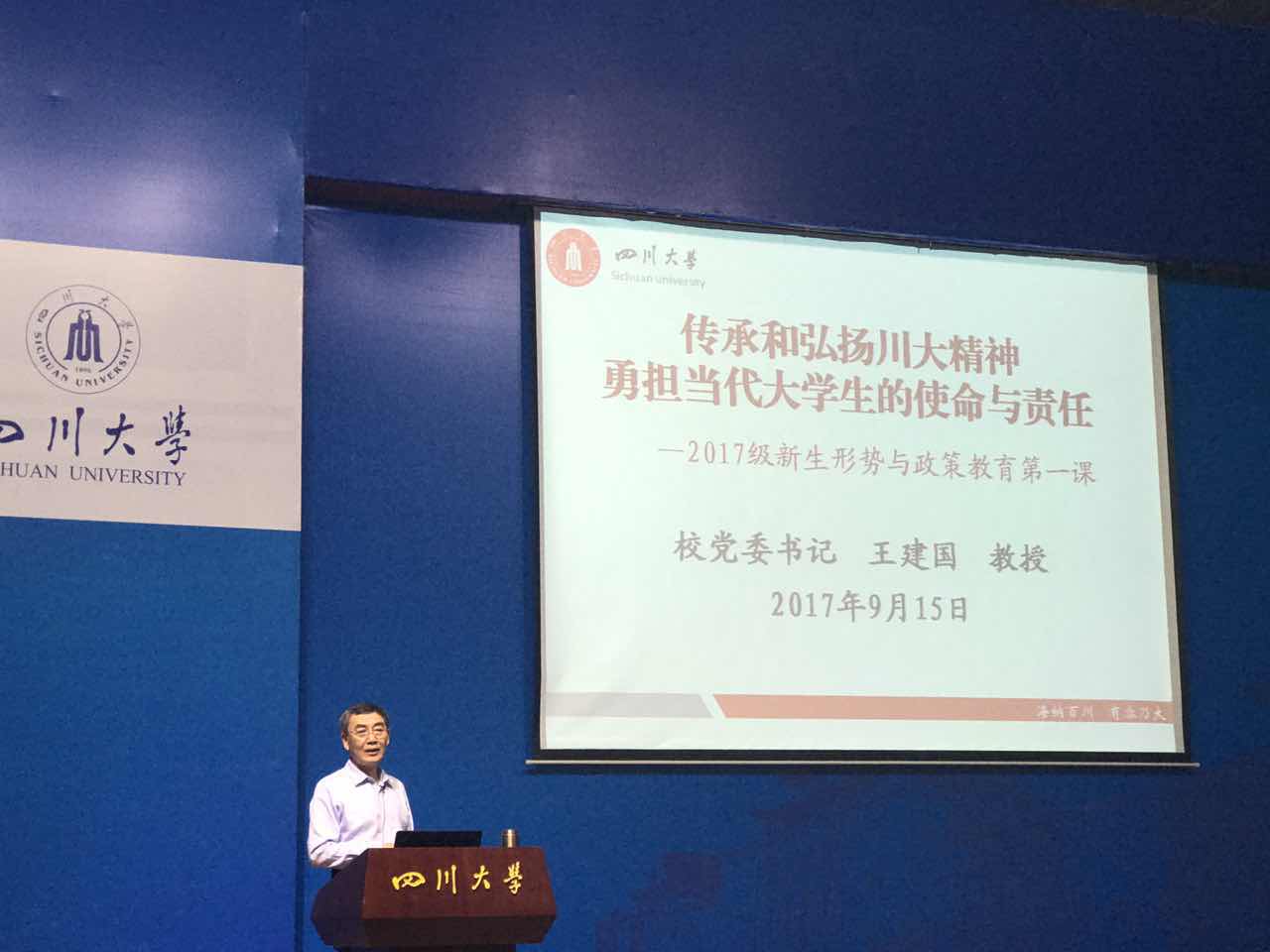 2017年9月15日下午2:30,校党委书记王建国教授为2017级新生讲授的“传承和弘扬川大精神,勇担当代大学生的使命和责任” 形势与政策教育的第一课在江安校区水上报告厅举行。水电学院新生辅导员老师带领30名学生代表现场聆听了本次授课。