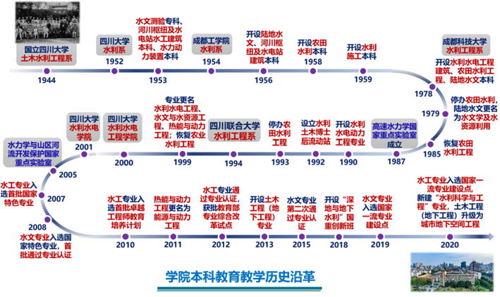 本科教育教学历史。学院本科教育教学历史源远流长,底蕴深厚,最早源于1944年国立四川大学土木水利工程系,1952年经院系调整形成较为完善的水利高等教育体系。学院秉承“广聚贤才、产研辅教、求真务实、治水报国”的办学理念,涌现出中国水利高等教育先驱吴持恭、丘勤宝、李国润等名师大家。